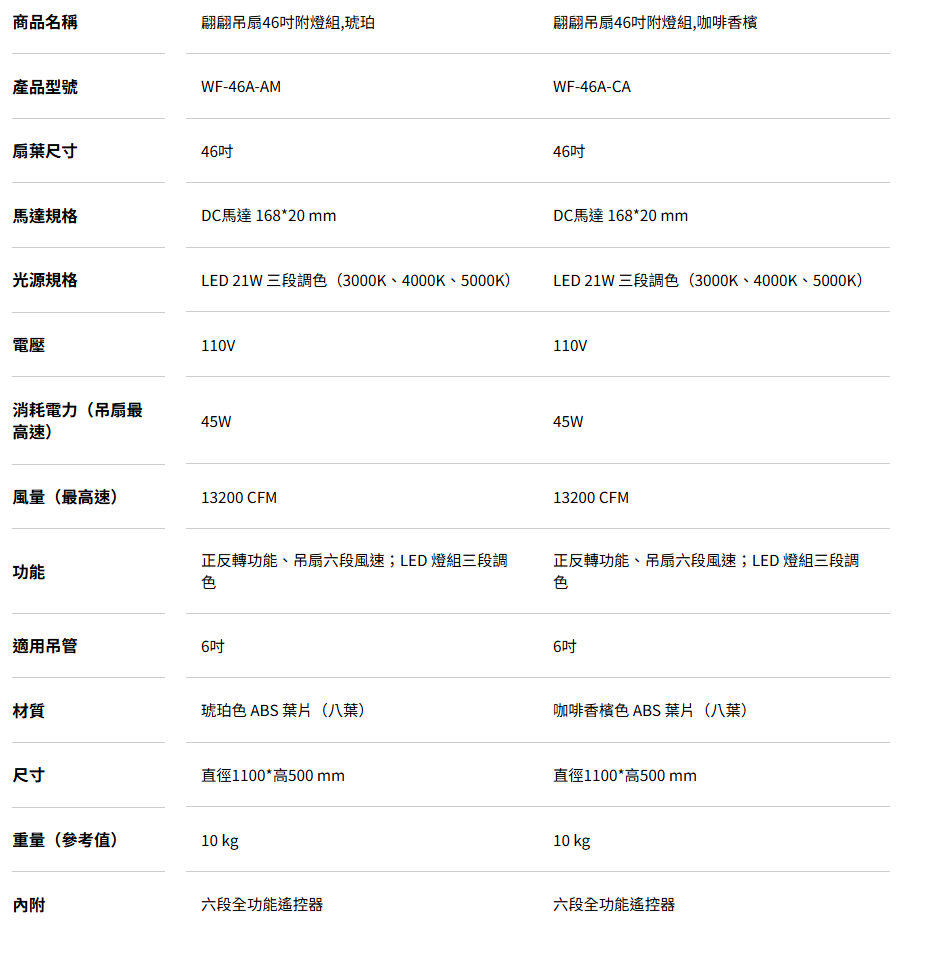 DC 變頻省電 六段變速附 LED 三段調色燈組兩種顏色可選:1. WF-46A-AM 琥珀 2. WF-46A-CA 咖啡香檳適用坪數 5-8坪※ DC 吊扇運轉時,請勿阻擋葉片轉動※ DC 馬達運轉需安裝葉片,請勿空載※ 為確保您的安全,此產品建議由專業水電人員進行安裝