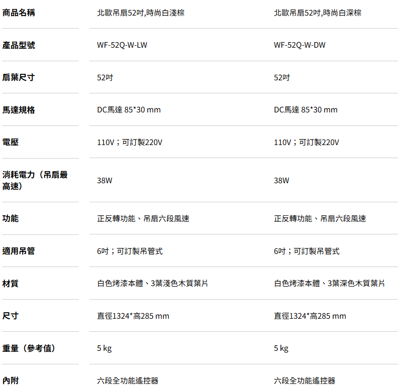 DC 變頻省電 六段變速兩種顏色可選:1. WF-52Q-W-DW 時尚白深棕2. WF-52Q-W-LW 時尚白淺棕※ DC 吊扇運轉時,請勿阻擋葉片轉動※ DC 馬達運轉需安裝葉片,請勿空載※ 為確保您的安全,此產品建議由專業水電人員進行安裝