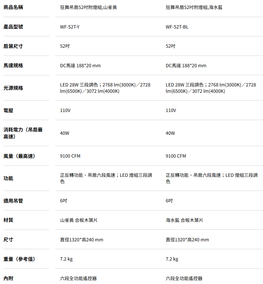 DC 變頻省電 六段變速兩種顏色可選:1. WF-52T-Y 山雀黃2. WF-52T-BL 海水藍※ DC 吊扇運轉時,請勿阻擋葉片轉動※ DC 馬達運轉需安裝葉片,請勿空載※ 為確保您的安全,此產品建議由專業水電人員進行安裝