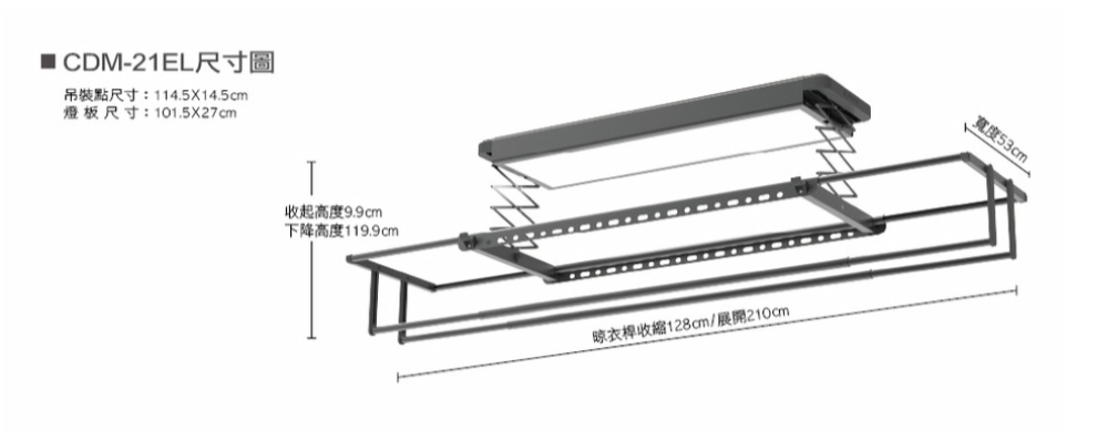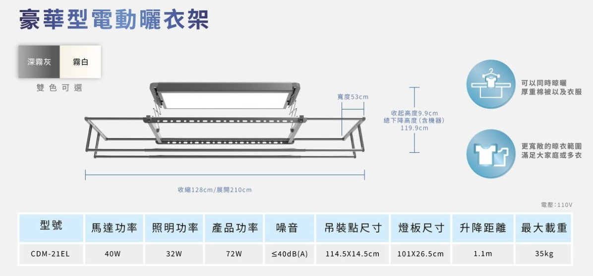 樂奇電動曬衣架(機),透過自動升降,讓晾曬衣服變得輕鬆省力,並結合智慧控制功能,使用無線遙控或語音控制,晾衣變得更加省時,進而提升日常家務的便利性。安裝於天花板的設計,不影響居住空間,讓生活更加舒適、美觀。2種顏色可選:深霧灰 CDM-21EL-B霧白 CDM-21EL-W嵌入尺寸:14.5X114.5 cm尺寸:收縮128cm/展開210cm電源規格:110 V消耗功率:100W/32W
