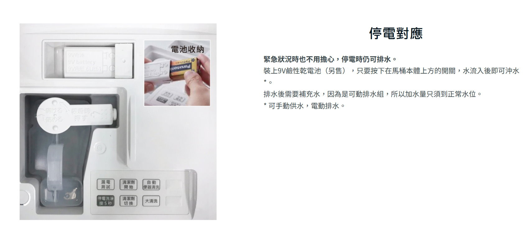 裝上9V鹼性乾電池(另購),只要按下在馬桶本體上方的開關,水流入後即可沖水*。