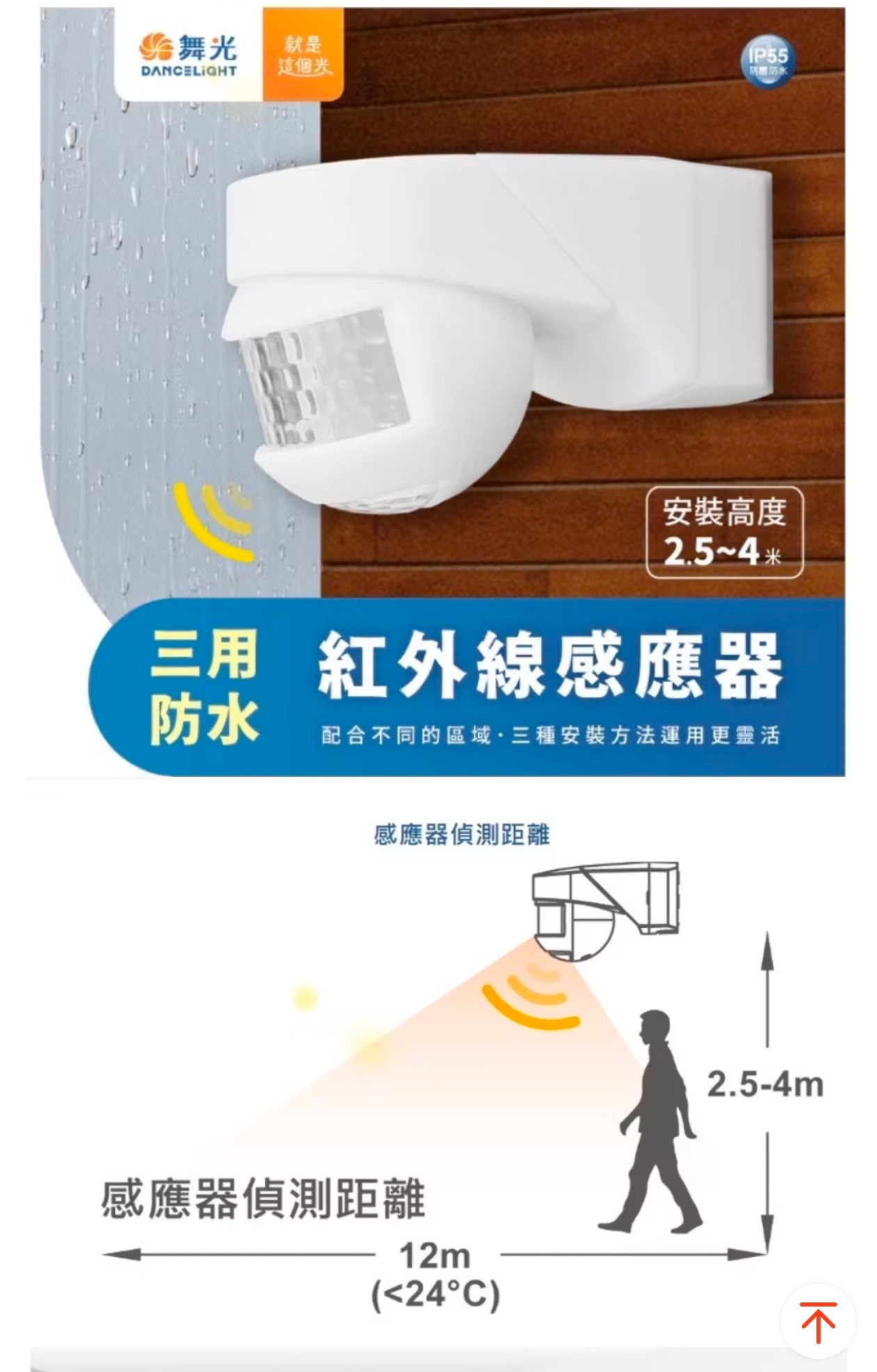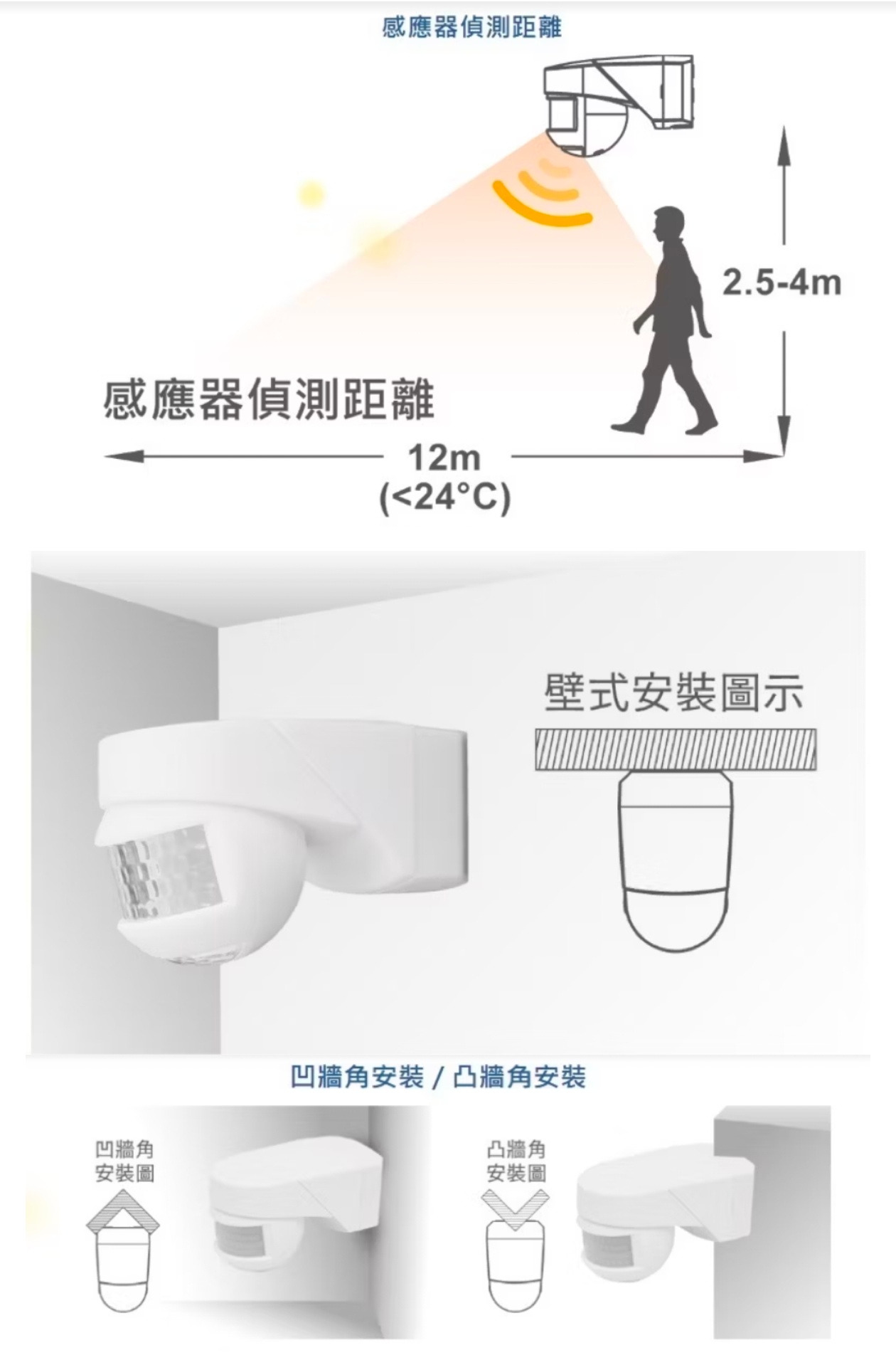 利用人體溫度感應,安裝高度2.5~4米,