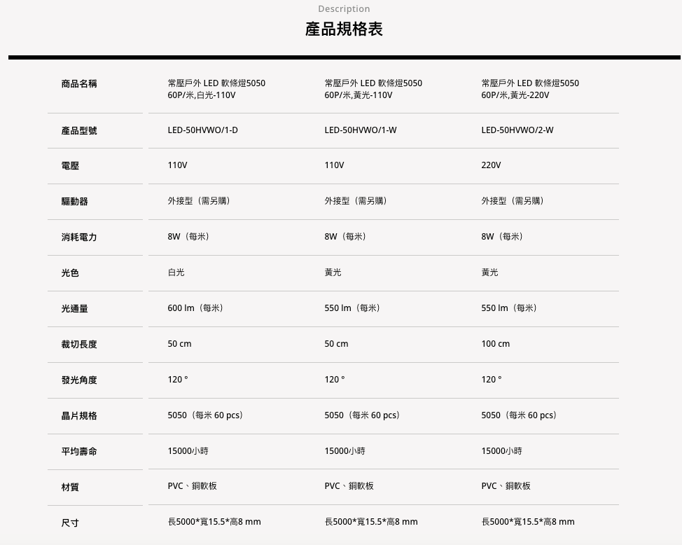 1.持久耐曬,不易變黃2.耐候抗UV3.防水公母頭,可直接串接*每捆5米,單一電源線可串接最長45米*110V每50公分一裁切單位*220V每100公分一裁切單位*內附配件,含電源線,固定夾.螺絲,插針,尾塞,接頭