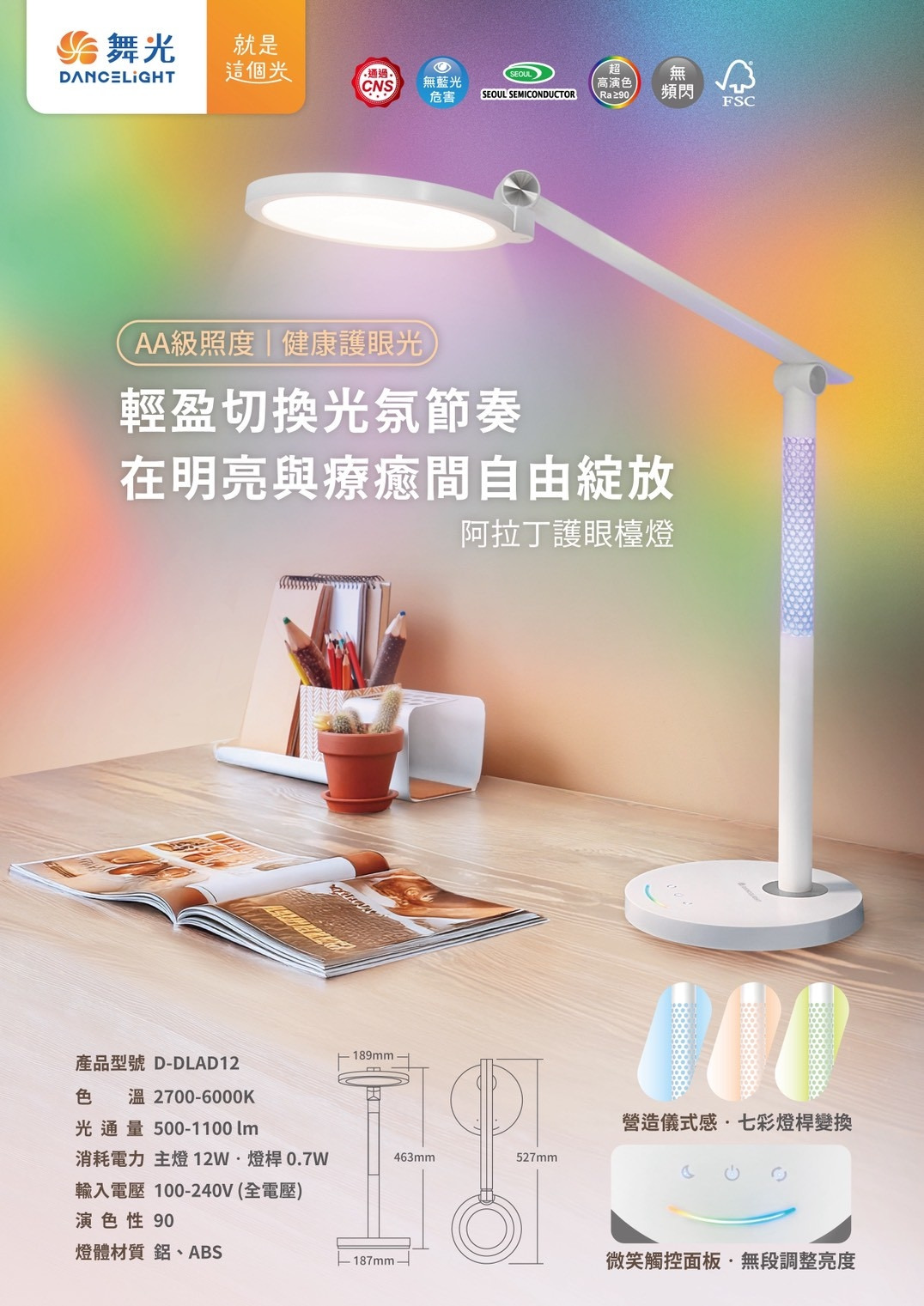 舞光D-DLAD12 調光調色 阿拉丁護眼檯燈 額定功率 : 主燈12W 燈桿0.7W額定電壓 : 100-240VAC 全電壓色 溫 : 2700K黃光~6000K白光亮 度 : 500~1100lm演 色 性 : ≥ 95 超高演色性尺 寸 : D: 189mm H: 527mm★ 產品特色 :✔ AA級照度、健康護眼光✔ 營造儀式感、七彩燈桿變換✔ 全光譜超高演色性 Ra 90✔ 微笑控制面板、無段調整亮度