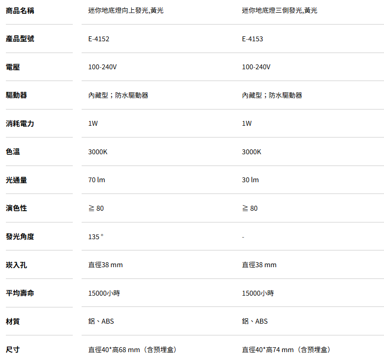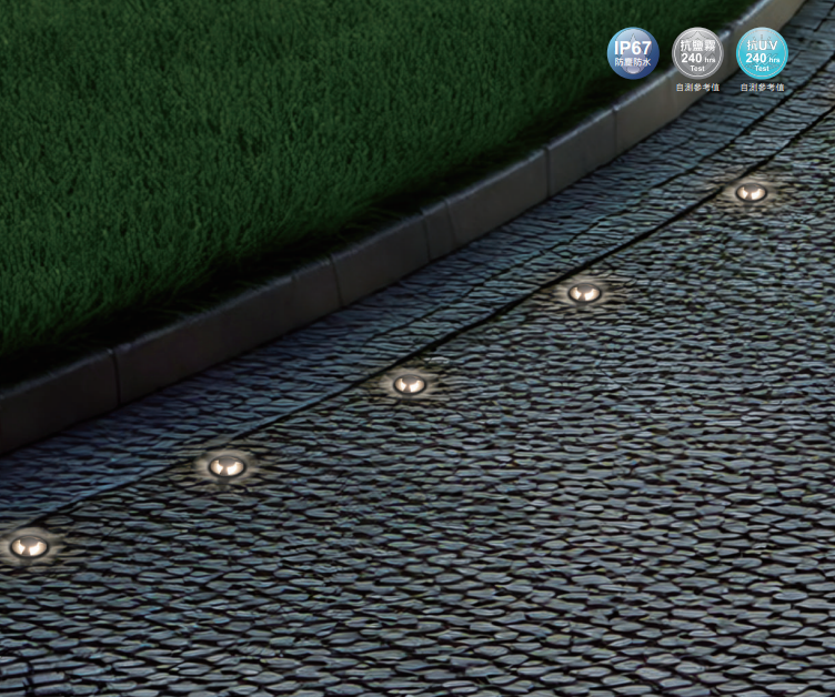 迷你地底燈-向上發光 E-4152迷你地底燈-三側發光 E-41531. 造型精緻小巧,均光不刺眼2. 二種發光造型設計可選3. 自測重量可承重2公噸物體經過4. 適用於戶外走道、階梯、廣場