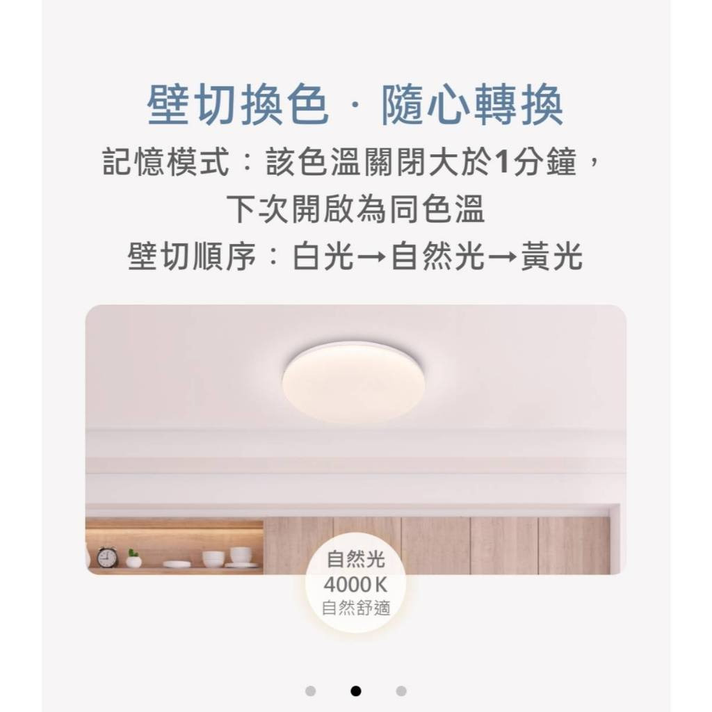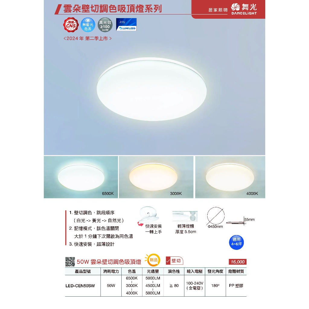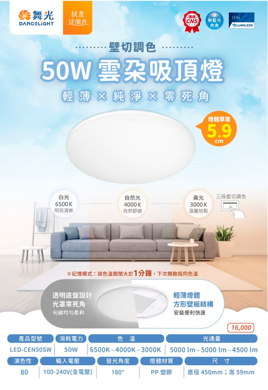 壁切調色跳段順序(白光/黃光/自然光)記憶模式該色溫關閉大於1分鐘下次開啟為同色溫快速安裝超薄設計產品規格50W壁切調色吸頂燈產品型號LED-CEN50SW電壓100 ~ 240V消耗電力50W色溫6500K / 3000K /4000K光通量5000lm / 4500lm/5000lm演色性Ra ≧ 80平均壽命15000 小時發光角度/光束角180°燈體材質pp塑膠尺寸Ø 450mm²;H 55mm