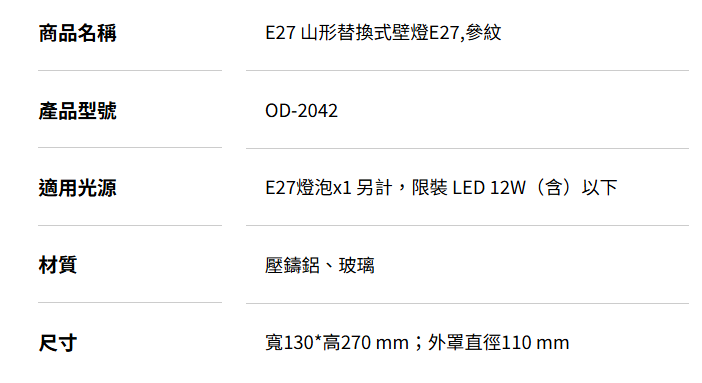 舞光 E27 山形替換式壁燈 OD-2042 高雄永興照明