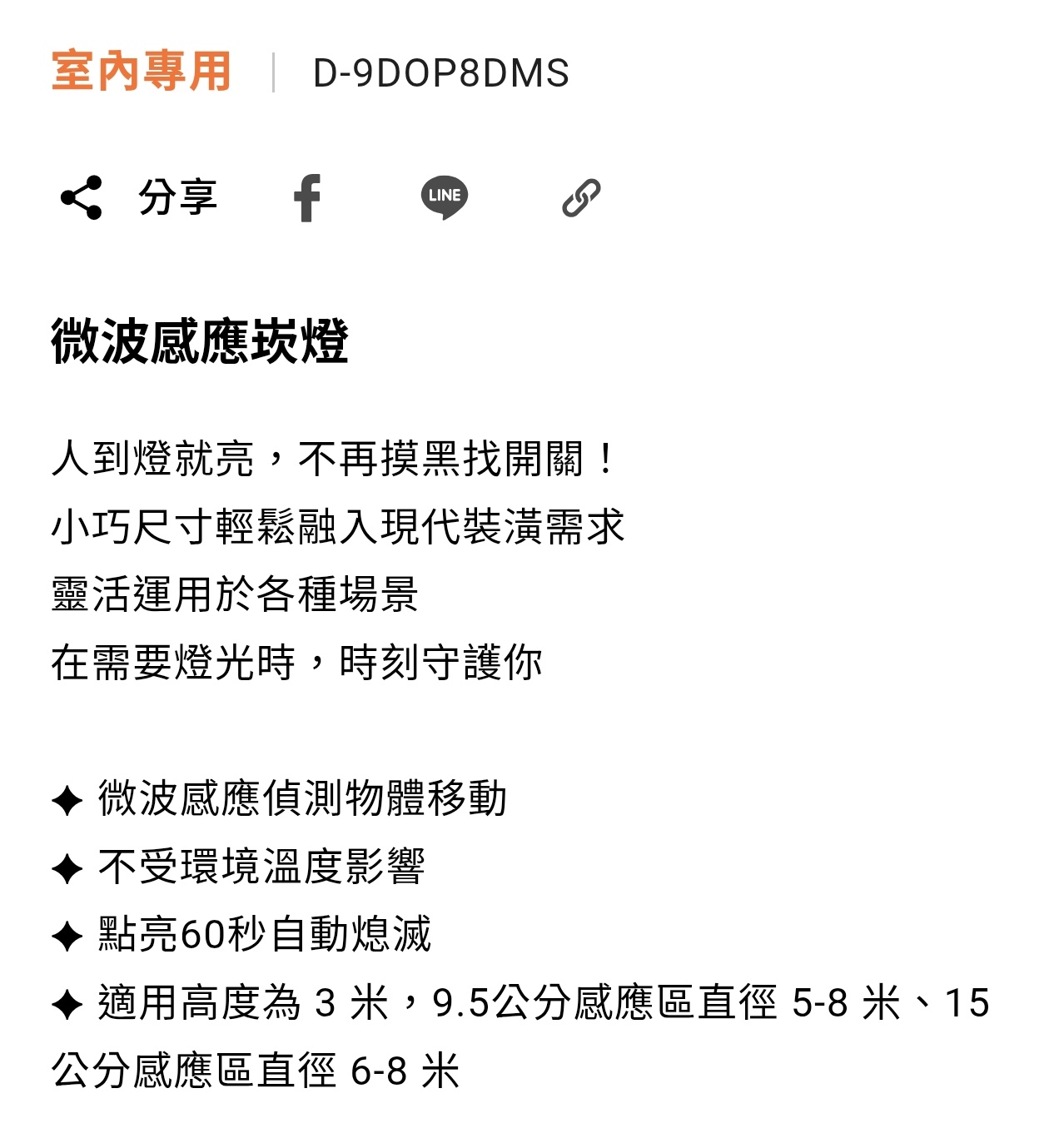 1. 24小時微波感應,經過感應範圍啟動點亮,一分鐘自動熄滅,達到自動節電效果