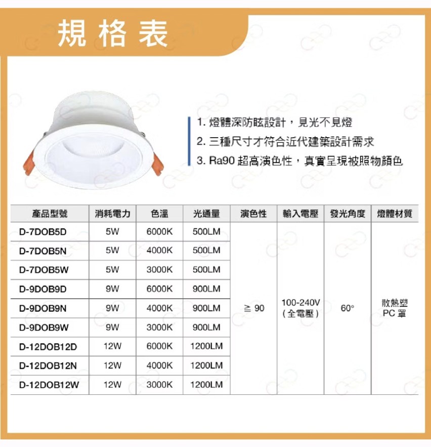 產品規格:9W(崁入孔9.5公分)