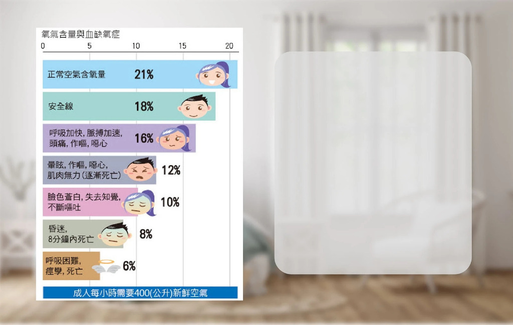因為使用冷氣或是為了防止灰塵、拒絕干擾、個人隱私、隔絕戶外噪音的種種因素下,而將家中的窗戶緊閉,而室內中存在的懸浮粒子濃度將越來越高,再加上可能出現的廚房油煙、菸味、殺蟲劑、油漆味等揮發性有害氣體,而造成空氣中的含氧量快速降低,實驗報告中,當2人於3坪臥室內關窗經歷2個小時後,室內二氧化碳等廢氣濃度竟高達2400PPM,專家指出:「空氣含氧量不足,會使人思想呆滯、不健康,更可能引發躁鬱等問題!」所以您必須正視您居家的空氣品質,不再讓家人置於危險的空間中。