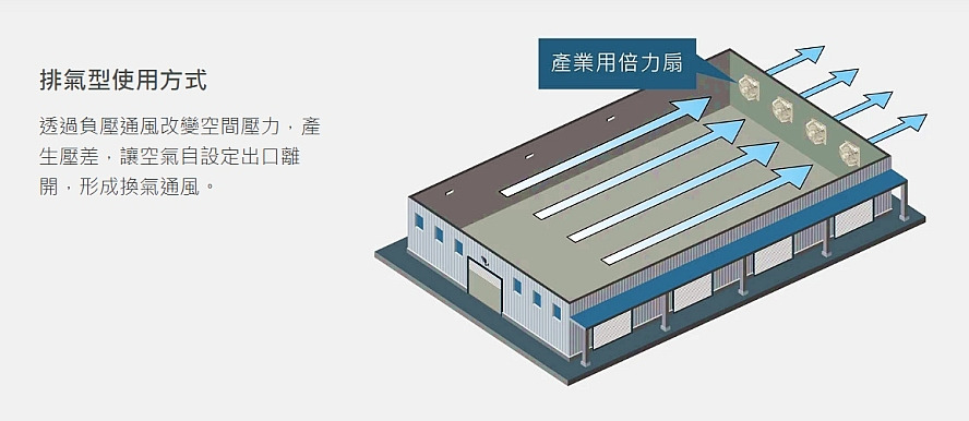 廠房內,採取負壓或正壓形式,將阿拉斯加產業用倍力扇安裝於一側的牆面,另一側可打開窗戶或是門口,將有效改善廠房通風不良、悶熱不適等問題,也有助於消除積存於廠房內空氣中的有害污染物。