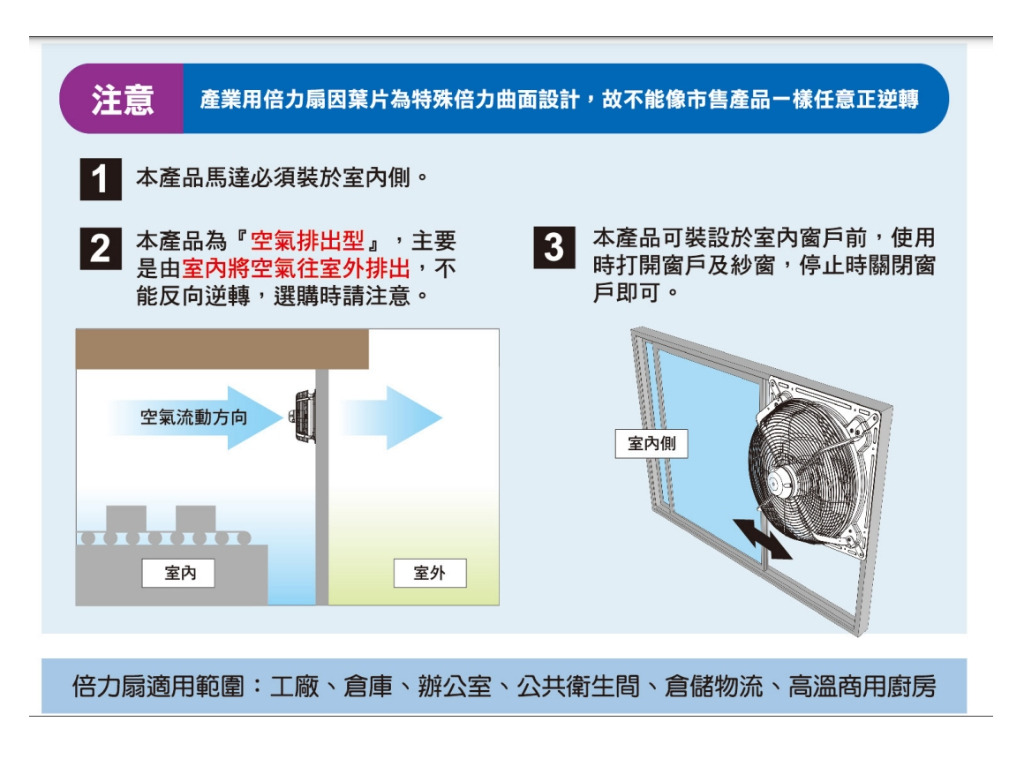 本產品馬達必須裝於室內側,由室內將空氣往室外排出