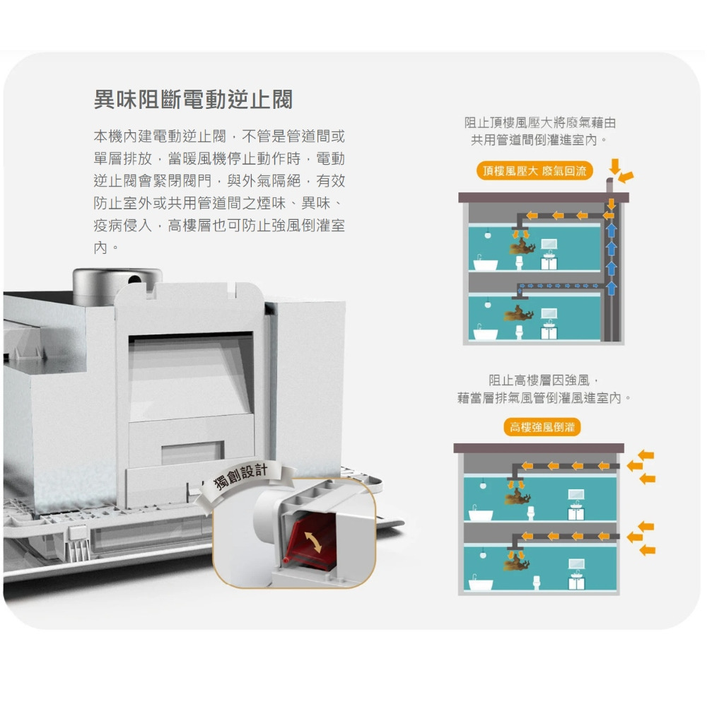 .異味阻斷:具有100%防異味及煙味倒灌之電動逆止閥