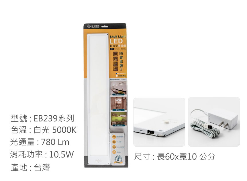 蝦皮會開立Email給電子發票 如需統編 請於結帳時選三聯發票【云光照明 】超薄按鈕式層光燈 全球最薄 厚度僅0.55cm全球最薄 厚度僅0.55cm★台灣製造、保固一年★快速安裝超方便★功耗:10.5W★色温:白光5000K ★0.55cm超薄簡約外觀,見光不見燈★LED側入大發光面,均勻舒適,不刺眼★兩段式調光(長按"按鈕處"約2秒)★建議安裝距離為95~105cm★尺寸: 長60,寬10,高0.55公分