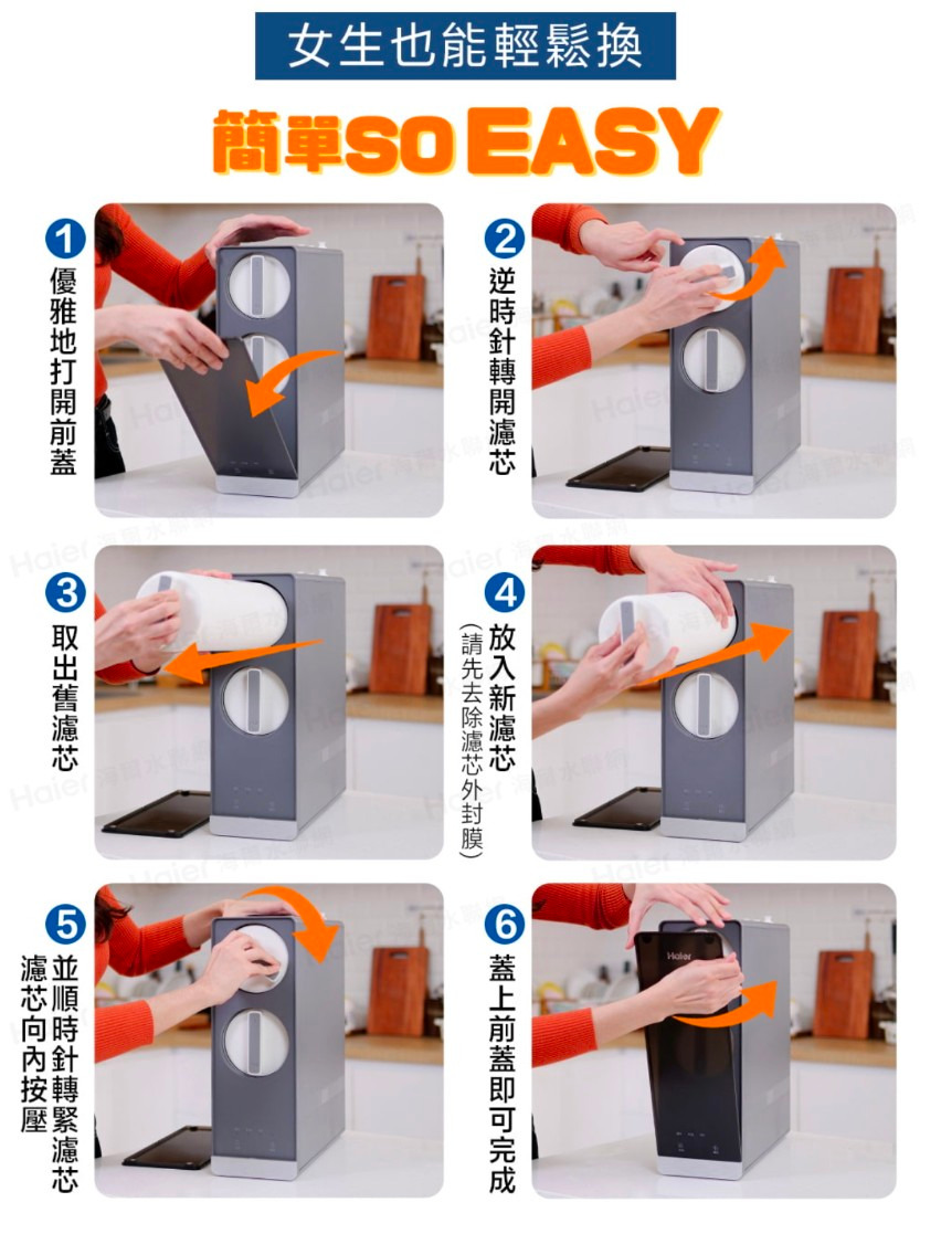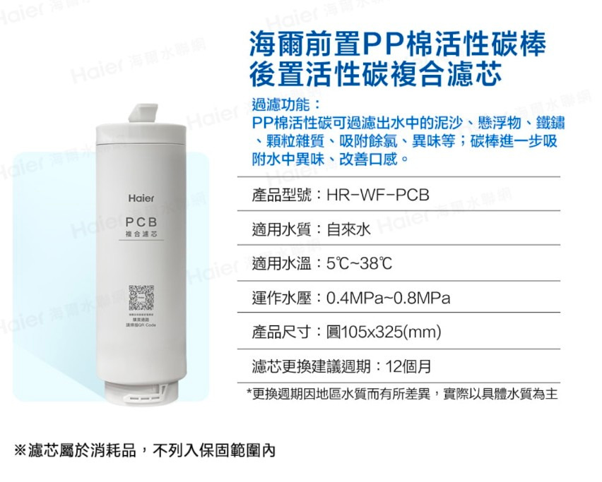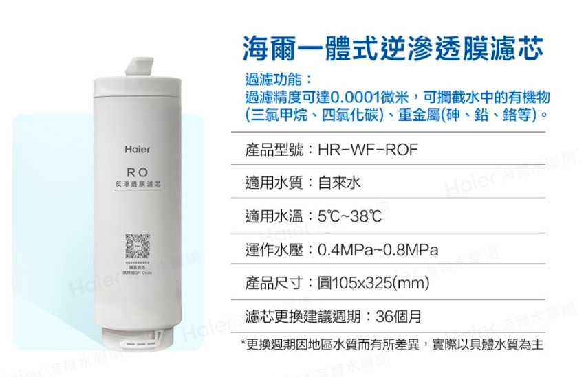 海爾RO一體式反滲透膜濾芯型號HR-WF-ROF商品規格 $105x325(mm)過濾精度0.0001pm適合水質 自來水適用水溫50C~380運作水壓0.4~0.8MPa建議更換週期36個月(依各地水質不同而有所差異)海爾活性碳複合式濾芯PCB型號 HR-WF-PCB商品規格 0105x325(mm)適合水質 自來水適用水溫 5*C〜380運作水壓0.4~0.8MPa建議更換週期 12個月(依各地水質不同而有所差異)