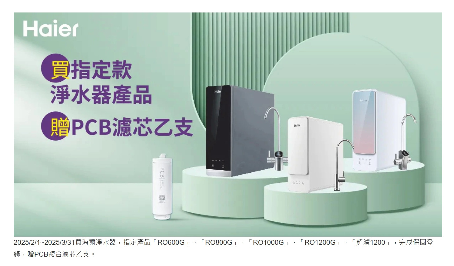 2025/2/1~2025/3/31買海爾淨水器,指定產品「RO600G」、「RO800G」、「RO1000G」、「RO1200G」、「超濾1200」,完成保固登錄,贈PCB複合濾芯乙支。