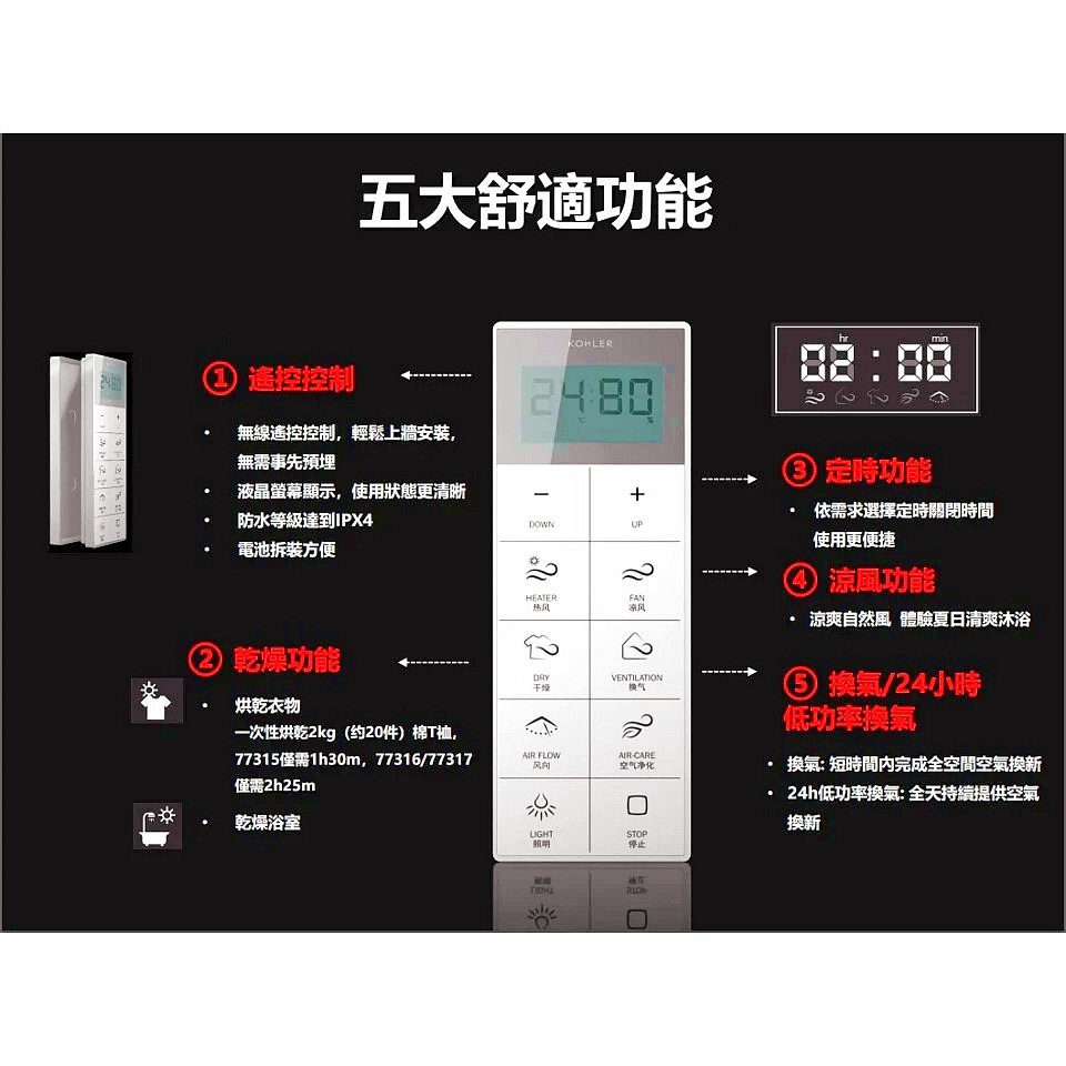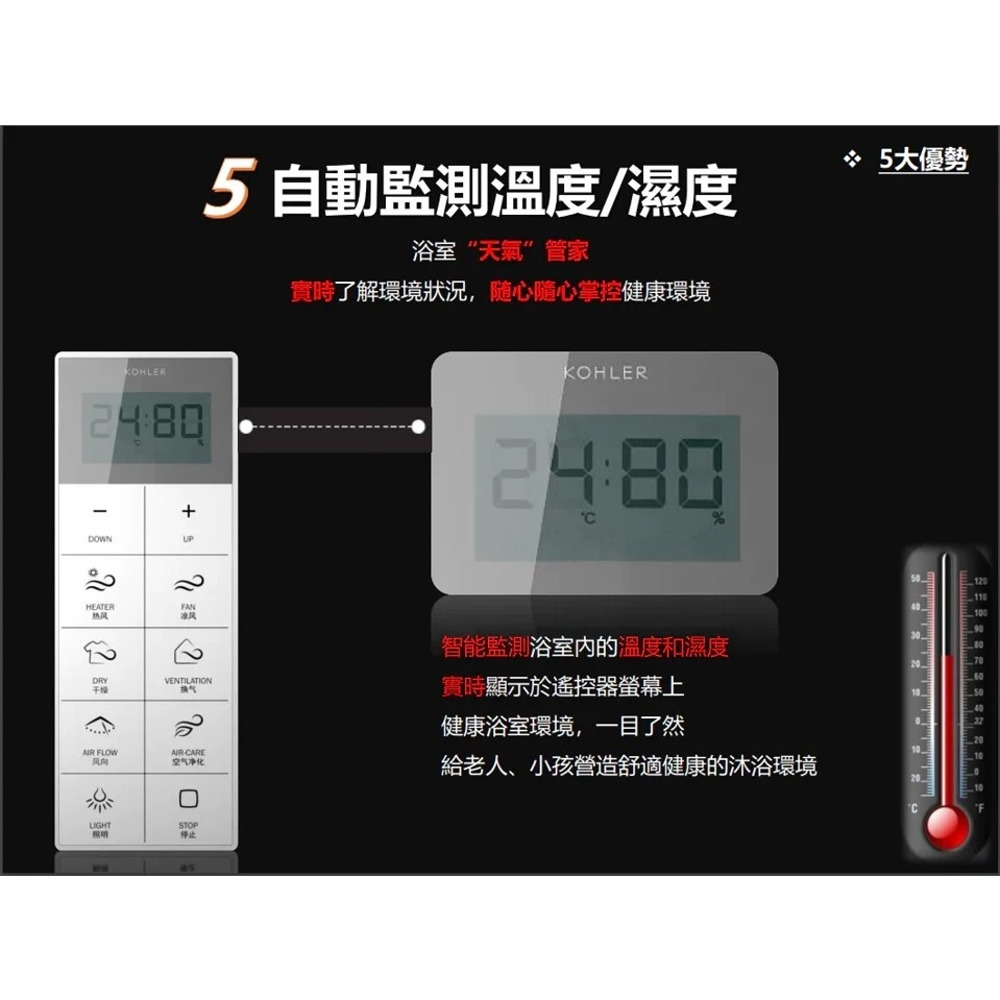 智能監測浴室內的溫度和濕度,並可同步顯示於遙控器上。