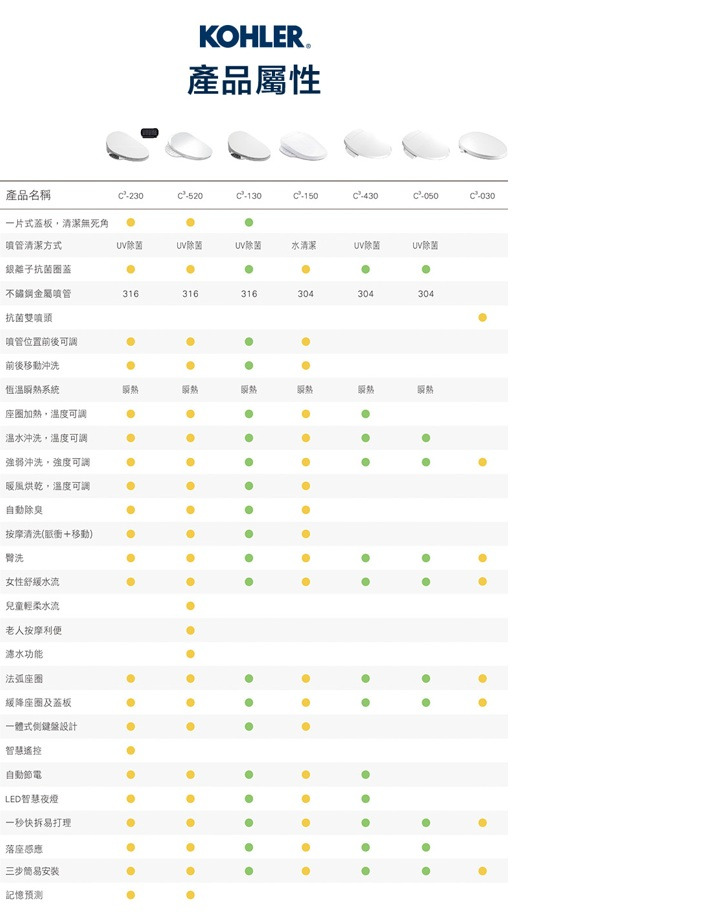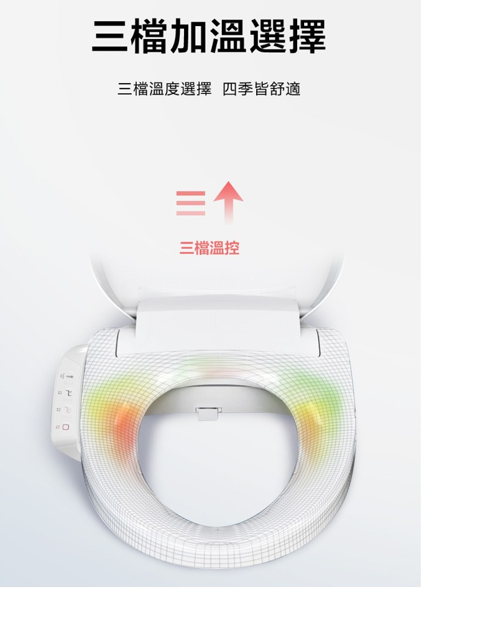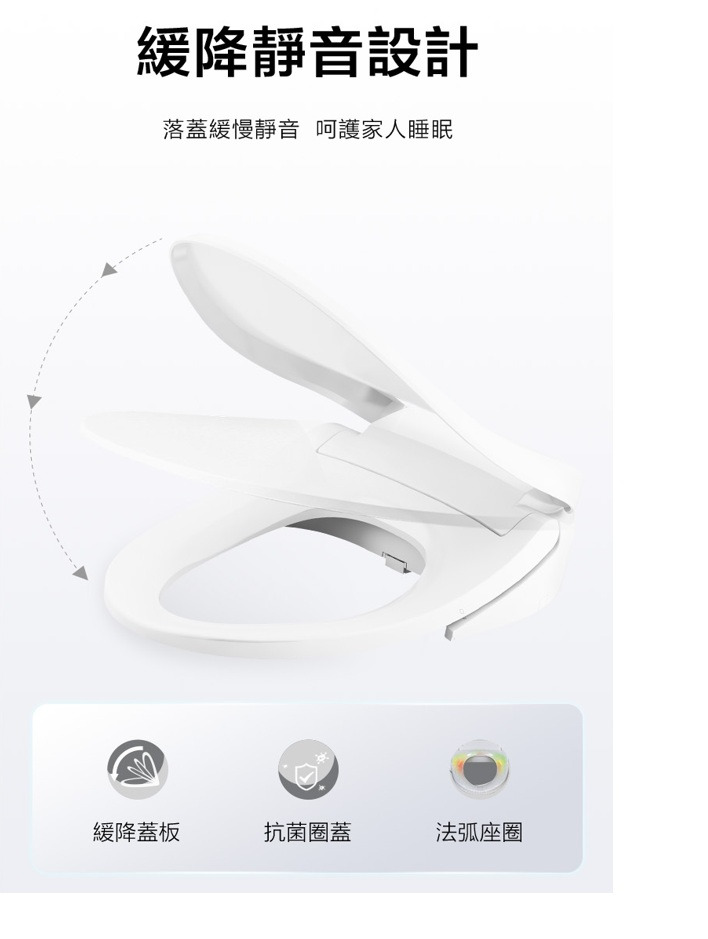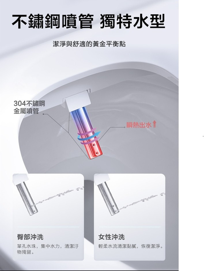 - 瞬間加熱技術持續提供熱水 水溫可調整 座圈(馬桶蓋座) 溫度可調整- 採不鏽鋼噴嘴,耐熱構造,比塑膠噴嘴更耐用、也比較容易清潔- 噴嘴自動清洗,在使用前後會自來水沖洗,具 UV 紫外線消毒功能 (定期 /自動除菌),保持衛生- 座圈與噴管使用抗菌材料- 有 LED 夜燈,夜間如廁時方便- 緩降靜音設計:蓋子與座圈關閉速度慢,不會砰的一聲- 快拆式鉸鏈:可以快速拆下座圈 /蓋子、方便清潔- 使用者感測器 :可以偵測有人在座或接近- 智能節電設計 (節能模式):當使用率低時,可進入低功率或待機狀態
