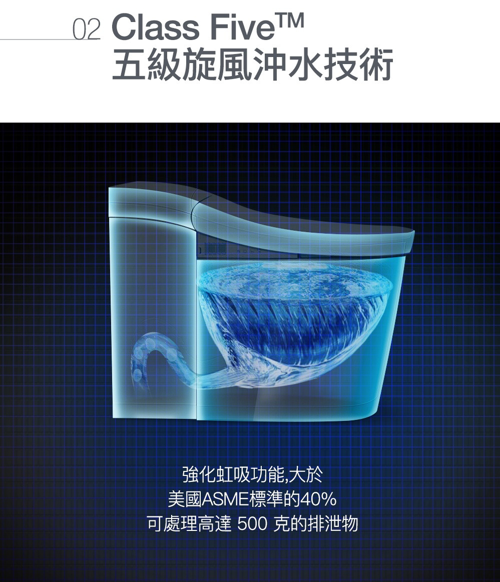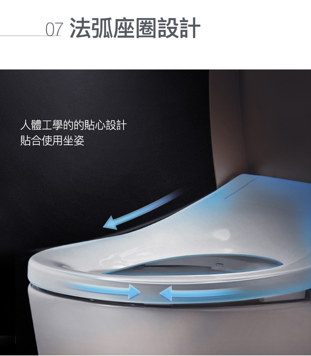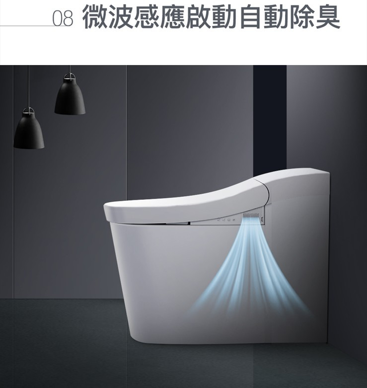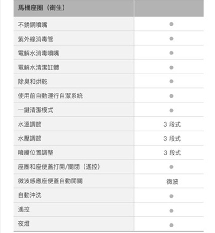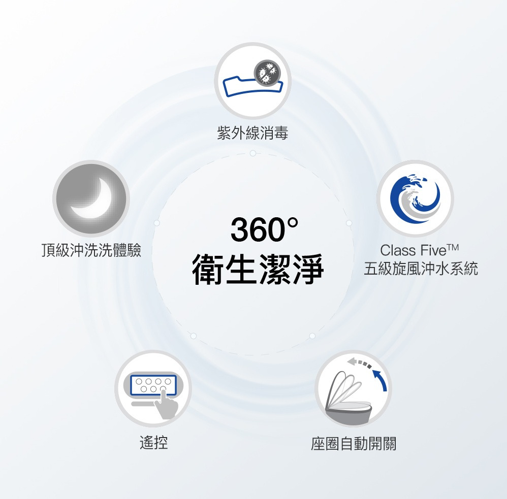 外觀設計: 馬桶貼牆設計 完美隱藏電路及水管管線清潔: 一支316不鏽鋼噴嘴含7個噴水孔 前洗淨和臀洗功能 可調節出水水壓 可調節出水水溫 可調節噴嘴位置 瞬熱技術(內建瞬熱系統)殺菌: 紫外線消毒 自體清潔噴嘴模式 缸體消毒(使用前洗淨) 抗菌座圈舒適: 加溫座圈 座椅溫度可調 暖風烘乾功能 除臭功能操控: 遠端操控操作更方便 座圈感應(電容式) 自動感應開/關 使用者接近時自動偵測其他: 節能模式 LED夜光照明