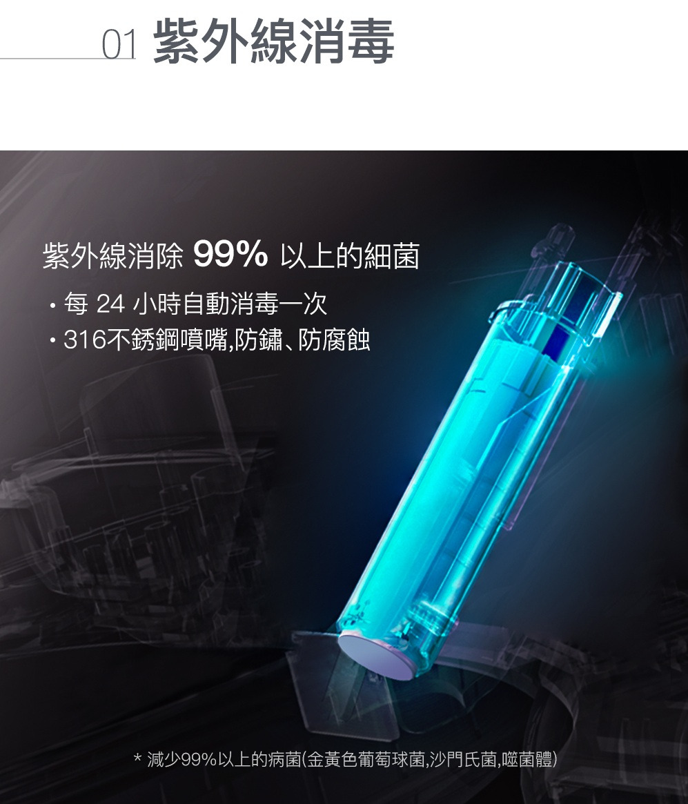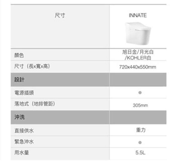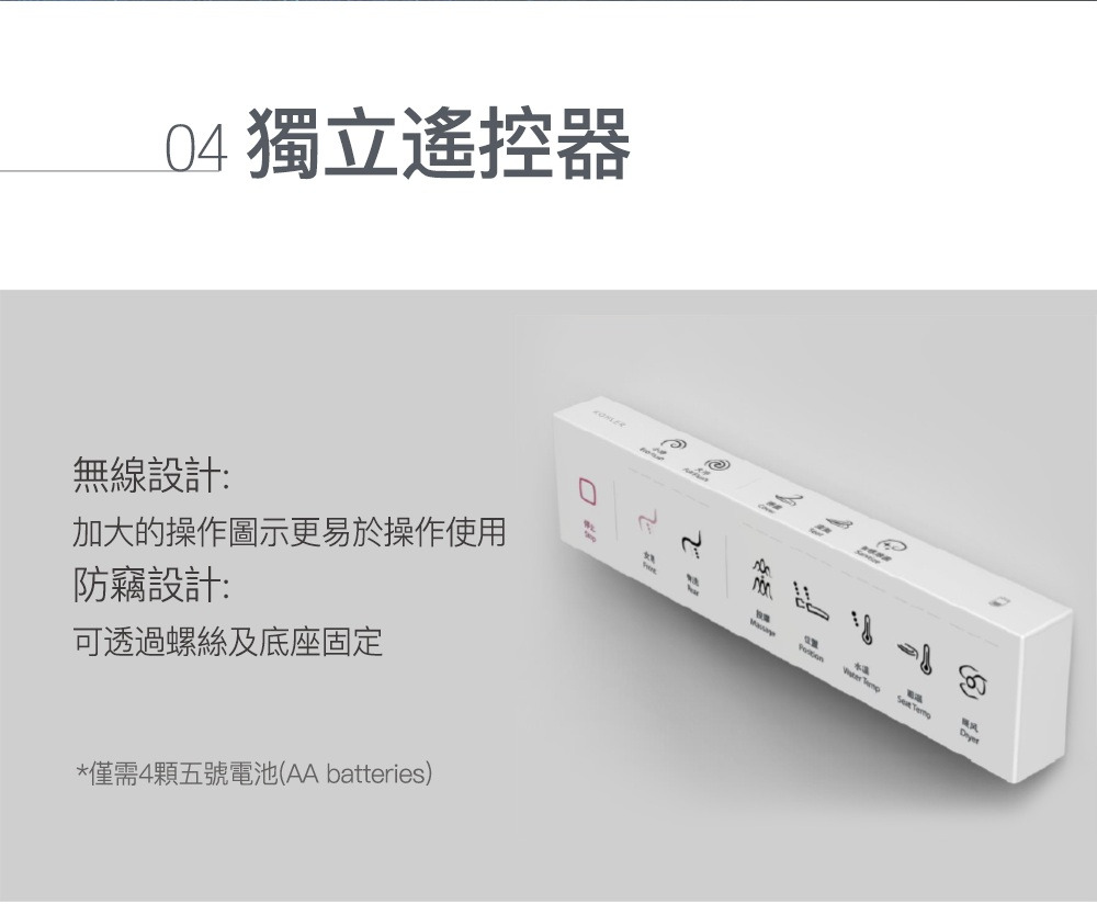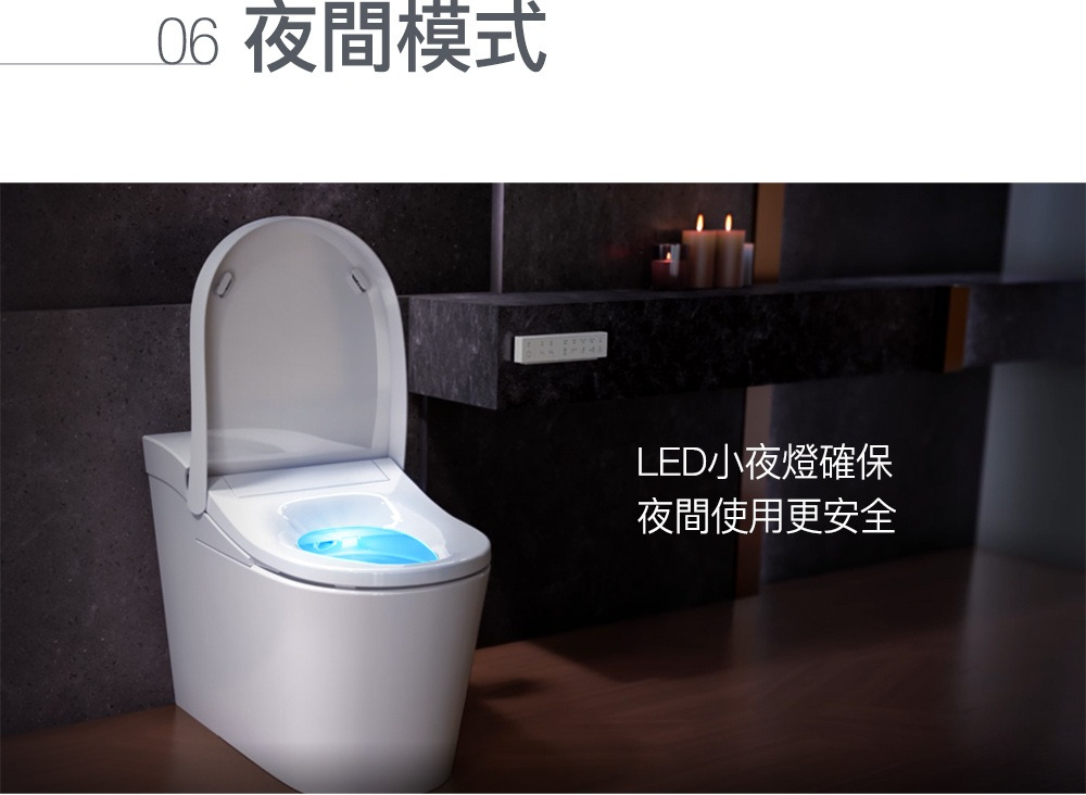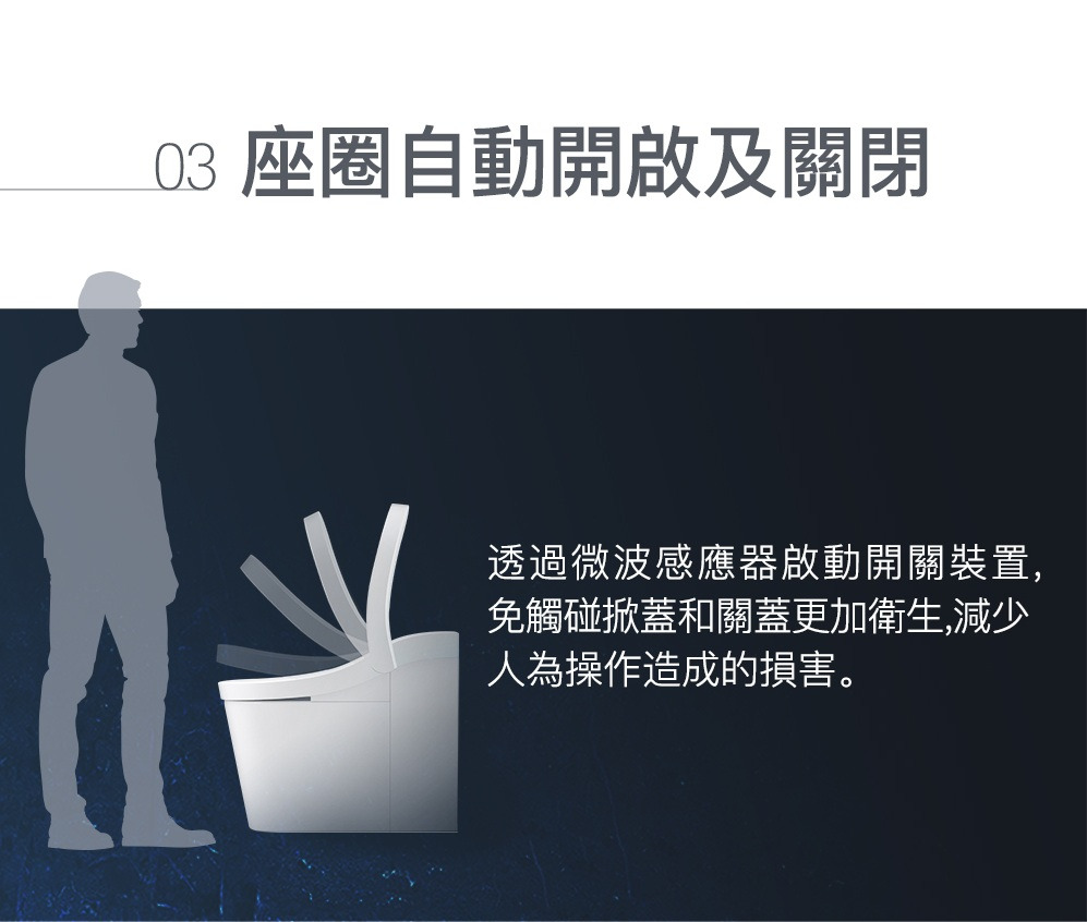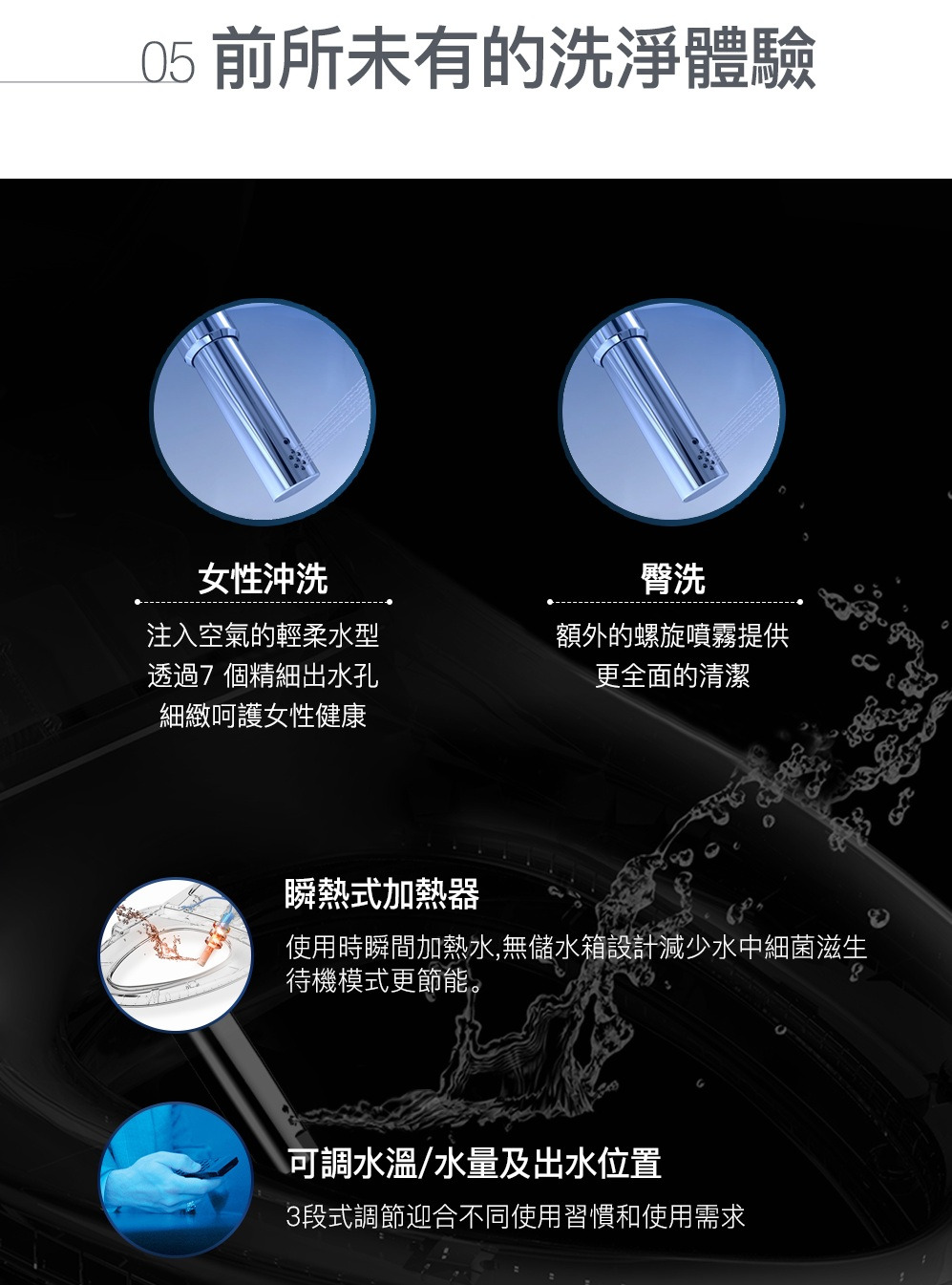 外觀設計: 馬桶貼牆設計 完美隱藏電路及水管管線清潔: 一支316不鏽鋼噴嘴含7個噴水孔 前洗淨和臀洗功能 可調節出水水壓 可調節出水水溫 可調節噴嘴位置 瞬熱技術(內建瞬熱系統)殺菌: 紫外線消毒 自體清潔噴嘴模式 缸體消毒(使用前洗淨) 抗菌座圈舒適: 加溫座圈 座椅溫度可調 暖風烘乾功能 除臭功能操控: 遠端操控操作更方便 座圈感應(電容式) 自動感應開/關 使用者接近時自動偵測其他: 節能模式 LED夜光照明
