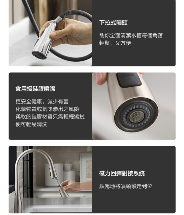 ●大膽多功能:奇系列廚房龍頭,它具有可伸縮噴頭,具有掃射功能,可形成強大的水流,方便清潔。強力耐腐蝕,防腐耐刮擦,符合GB18145和AB1953重金屬標準。 嚴格限制鉛、鎳、汞等17種重金屬以保證健康安全。