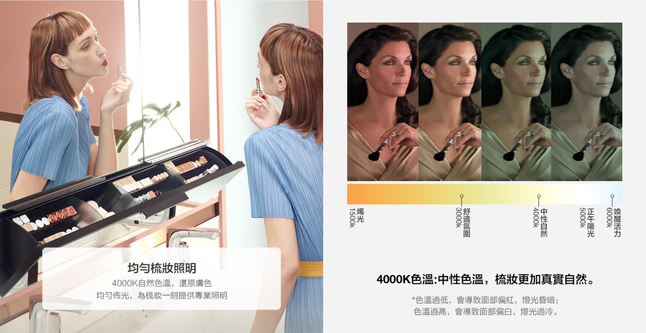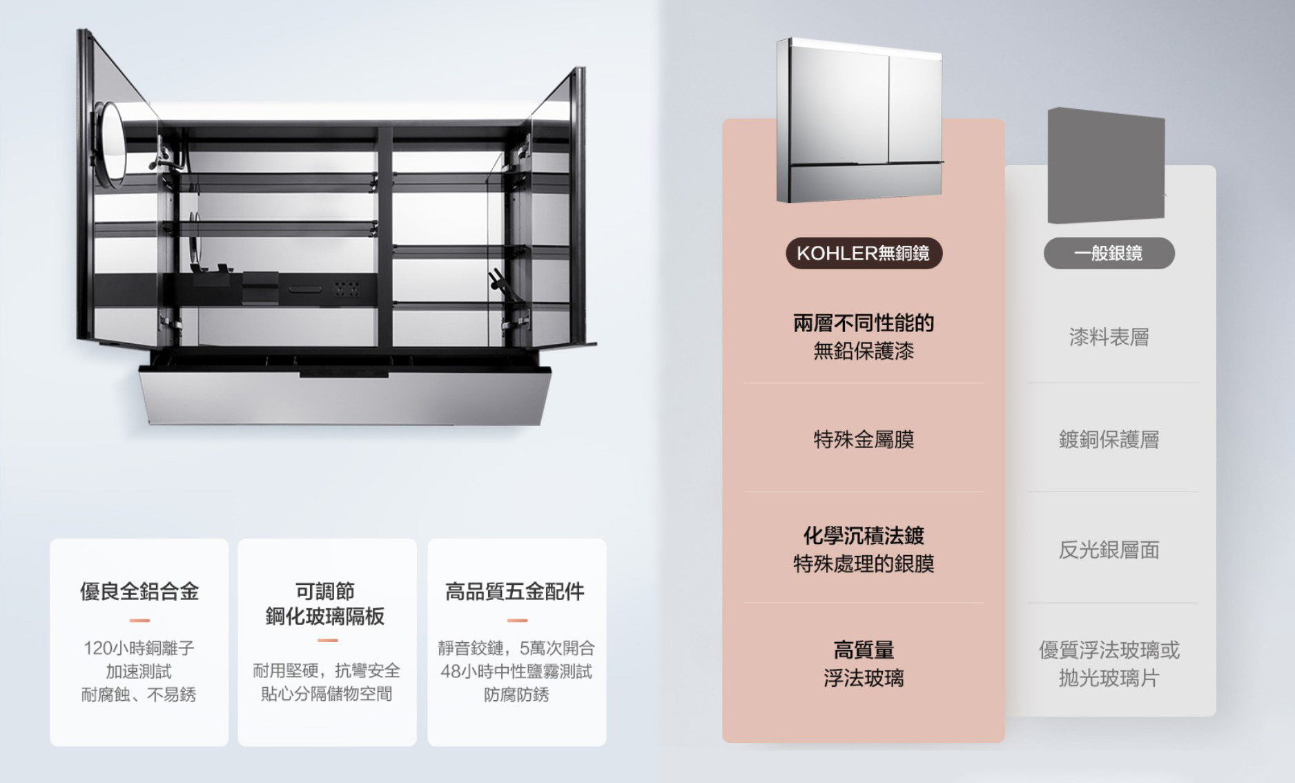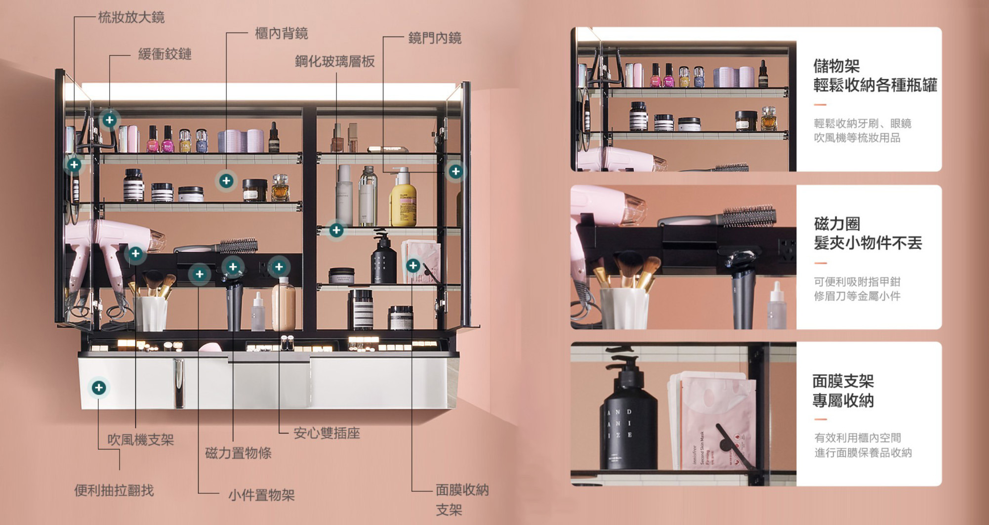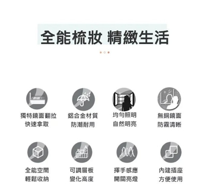- 均勻布光的梳妝LED照明,配以4000K自然色溫,為梳妝一刻提供專業的輔助- 隱藏式揮手感應燈控,輕輕揮手即可控制鏡燈及防霧電源開關- 特有便捷翻抽設計,方便收納常用的化妝品和保養品,不開鏡門也能輕鬆取出使用- 櫃內多處巧妙收納設計,吹風機支架、插座、小件置物架、面膜支架、磁力圈,各種物品專屬空間,一應俱全- 鏡面配備電加熱防霧功能,時刻保持鏡面清晰- 安裝本產品需預留電源線(110V),無需預留插座。- 開門方向:對開