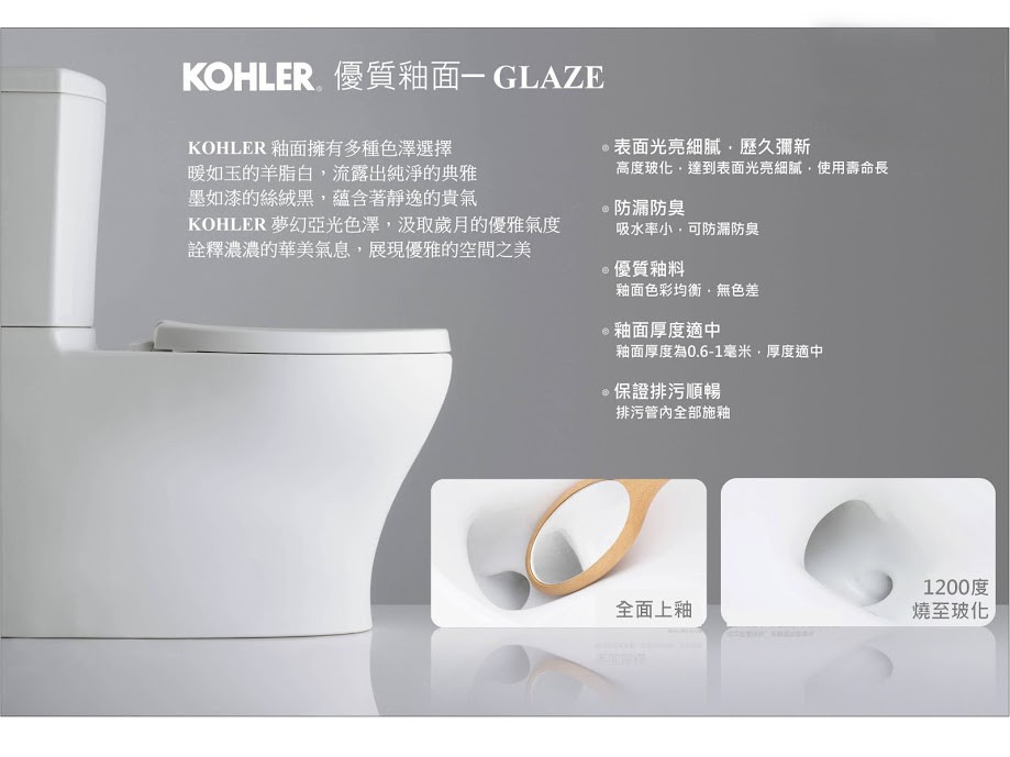 表面處理:KOHLER Glaze 高度玻化釉面,可提升耐用與易清潔性