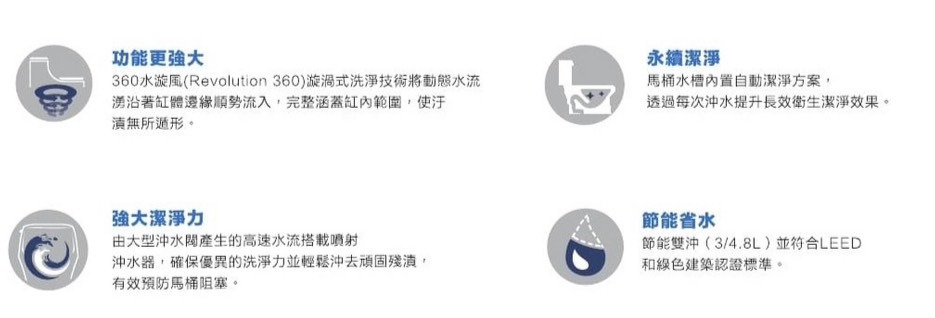 沖水量:3/4.8 公升,節能雙沖,並符合LEED和綠色建築認證標準。