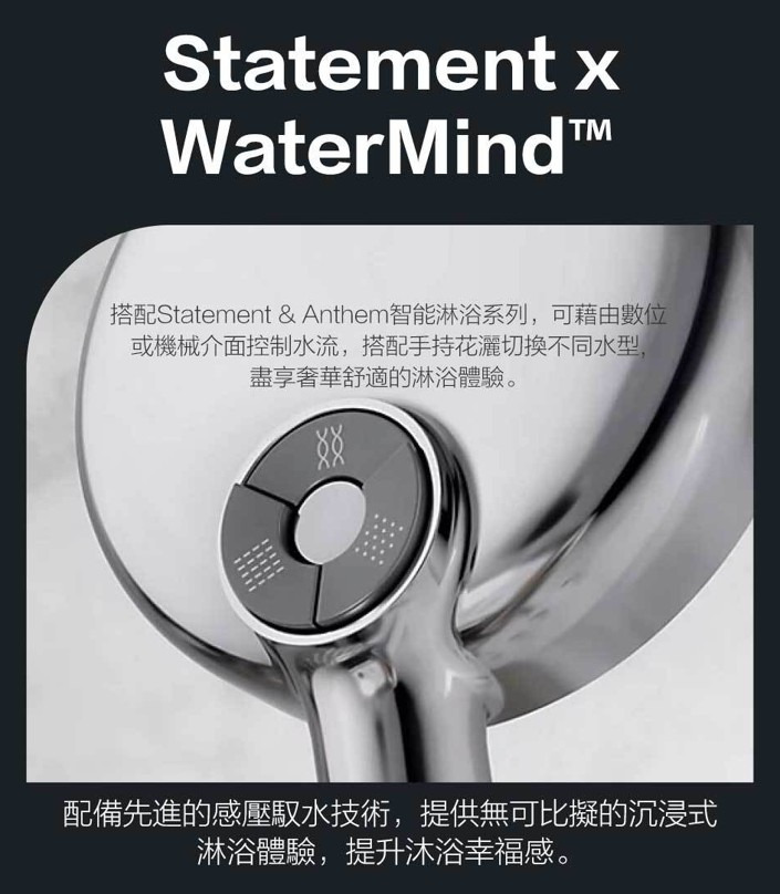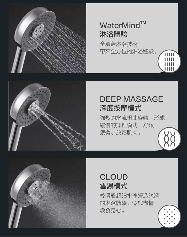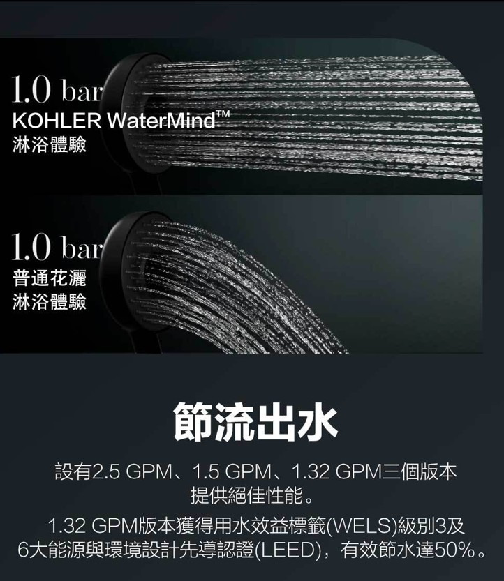 感壓馭水技術自動感應水壓強度,自動調節出水噴頭從此揮別水壓不均節流出水設有2.5GPM 1.5GPM 1.32GPM三個版本提供絕佳性能人體工學設計60個出水噴頭提供最大180毫米覆蓋範圍防滴漏 避免水垢堆積出水噴頭最薄僅0.1mm自動感應水壓變化
