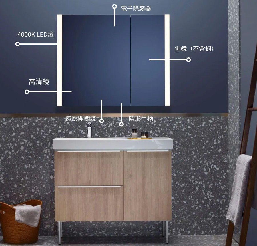 採用嵌入式LED燈設計,可均勻照亮鏡面的每個角落
