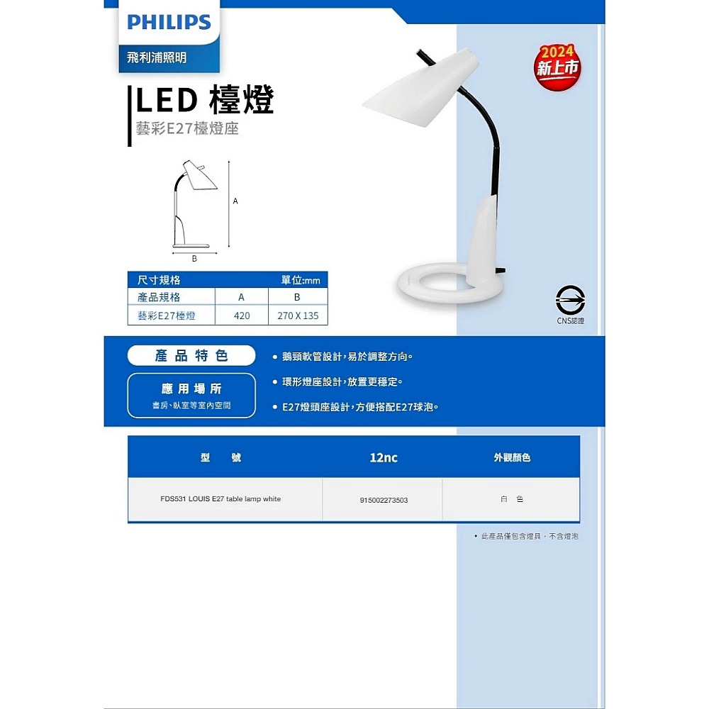 Philips 飛利浦 藝彩檯燈 FDS531 E27 可換燈泡 白色 高雄永興照明廚衛