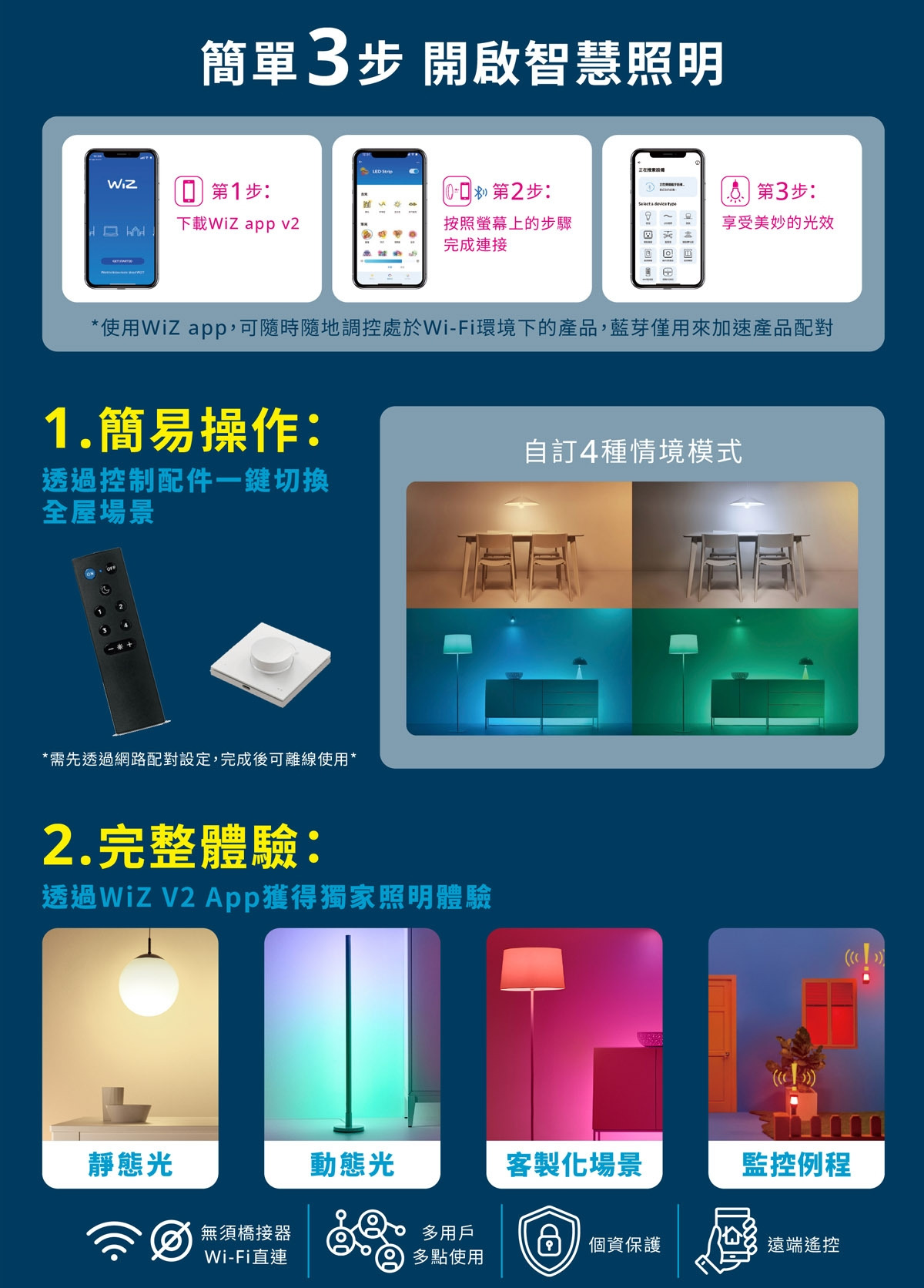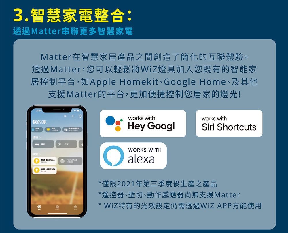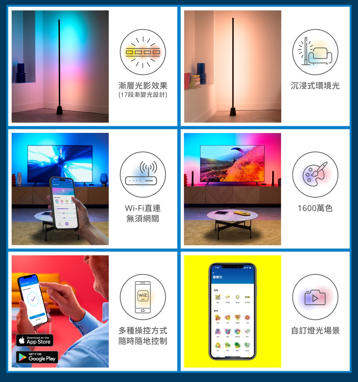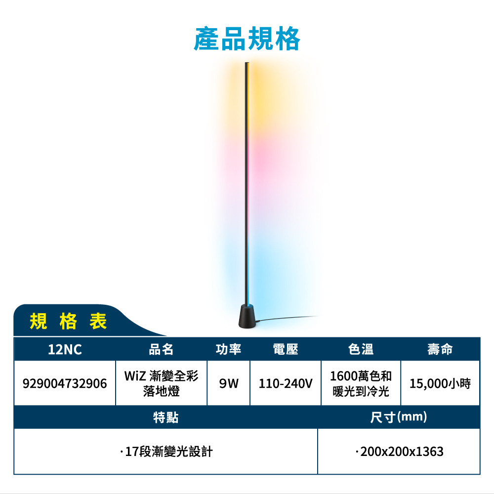 - 17段漸變,直橫兩用- Wifi直連,不須網關,APP一鍵搞定- 多種操控方式,隨時隨地控制- 作息節律日常光配方,自訂燈光場景- 彩光氛圍1600萬種色彩自由變化- 壽命15000小時- 2年保固