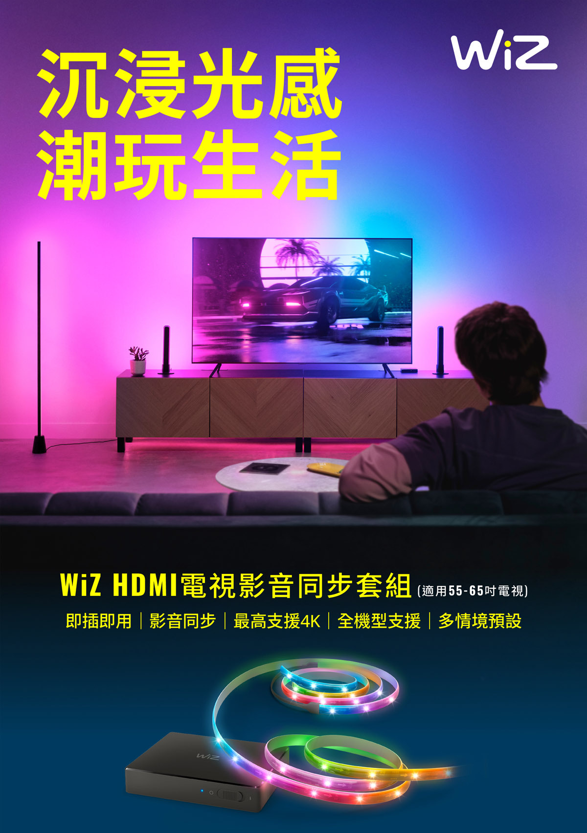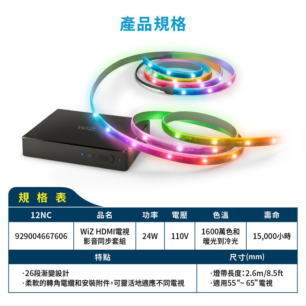 - Wiz 系列打造智能居家環境- 26段漸變光設計- 燈帶長度約2.6M 適用55~65吋電視- 燈光影音遊戲娛樂同步- 支援最高8K 60Hz / 4K 120Hz 格式- 可支援最多4個HDMI設備