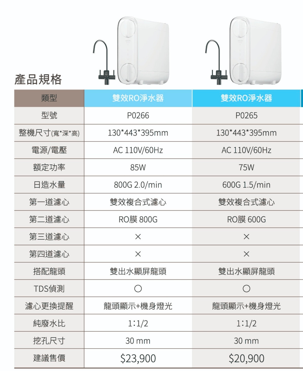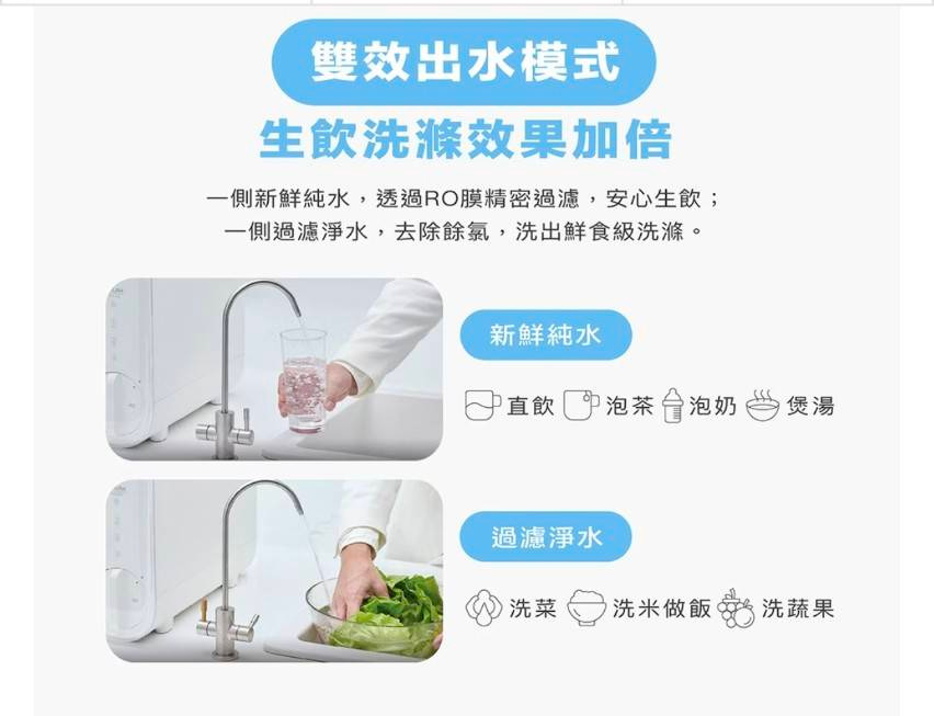 ◎ 雙出水模式,可依需求選擇純水生飲或過濾水洗滌