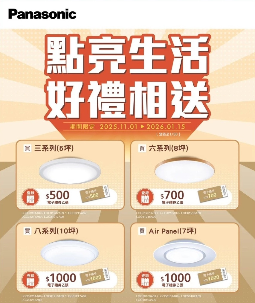 再加碼好禮回饋 — 購買吸頂燈指定機種,登錄送最高千元禮券!