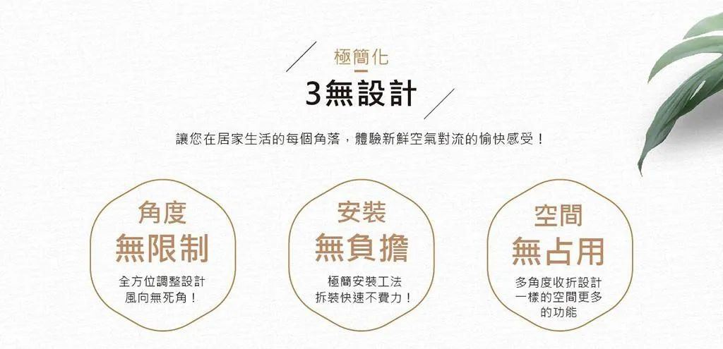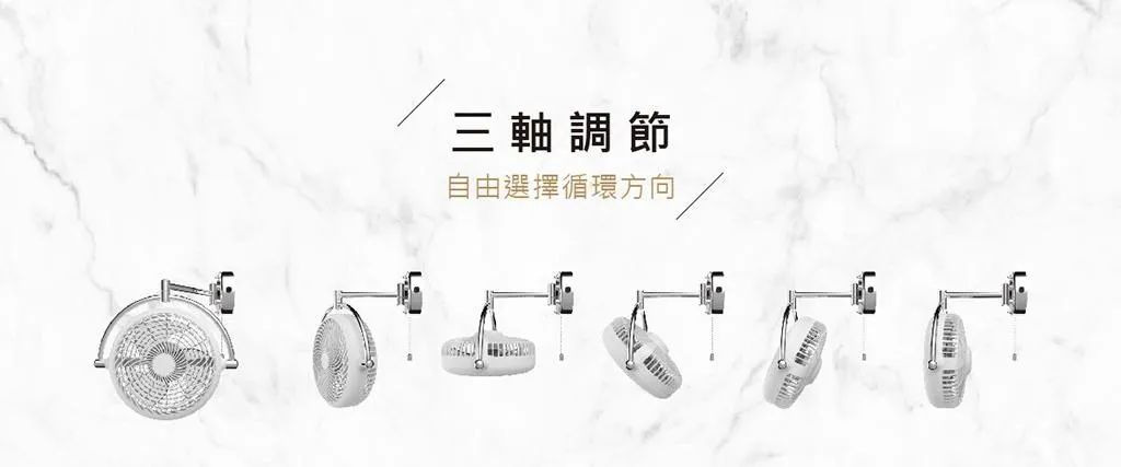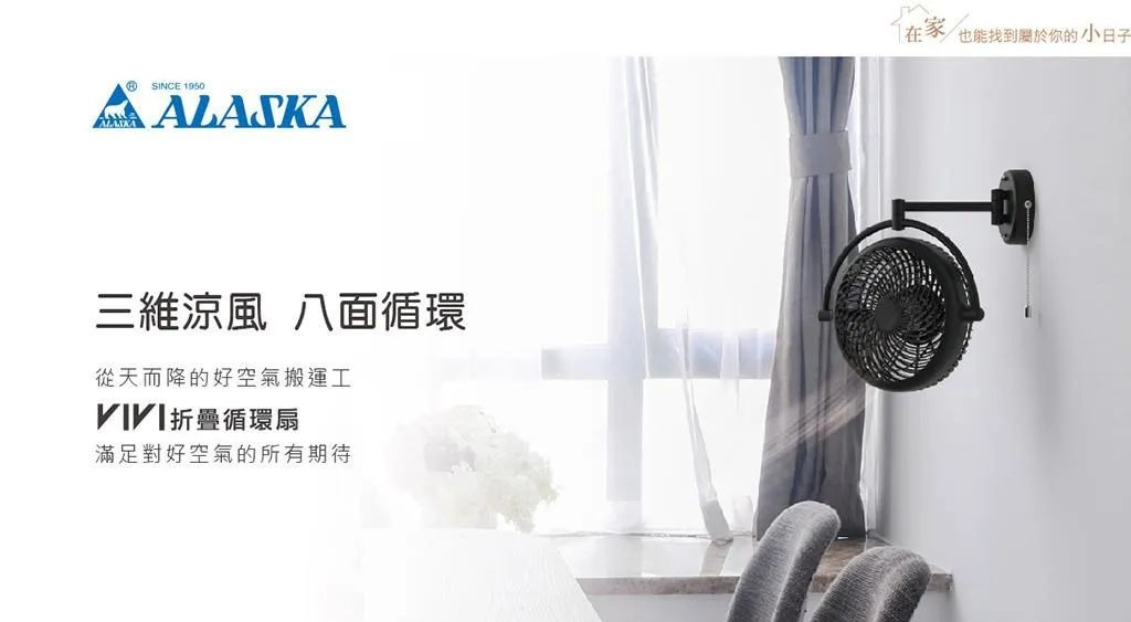 阿拉斯加的「VIVI折疊循環扇」,簡易安裝至牆上,透過三軸調節的設計讓風扇能突破角度限制,零死角的調整風向,具備風量低、噪音小的優勢,不需擔心收納、噪音問題,